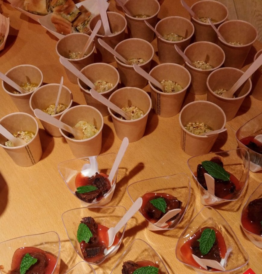 Il menu era composto da: Torta di verdura in pasta matta, come si fa a Ponente – Bicchierino di purea di ceci e basilico con nocciole – Fondente di cioccolato accompagnato da crema di fragoline e menta.