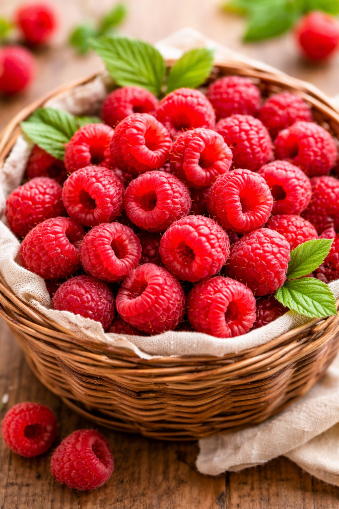 I lamponi freschi apportano vitamina C, fibre e antiossidanti. Durante la cottura rilasciano il loro succo, creando leggere venature rosate nell’impasto e bilanciando la dolcezza con una nota fresca.