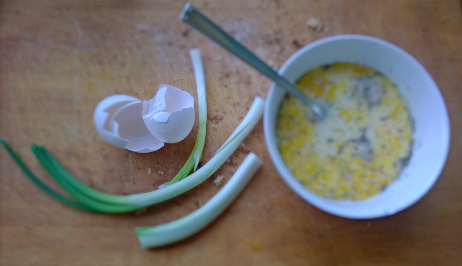 • Sbattete le uova con il latte, l’erba cipollina, il pepe e la noce moscata e rovesciate il tutto sul pane.